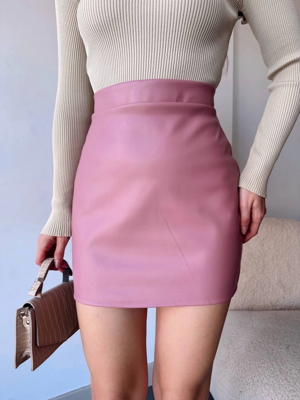 Düz deri etek pudra h24468, şıklık ve zarafeti bir arada sunan bir parçadır.